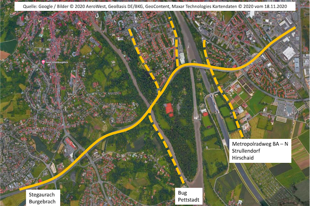 Und wie soll das funktionieren? Dazu sind aus Sicht des VCD Bamberg keine Verbote erforderlich. Hain und Adenauerufer sollen weiterhin mit dem Fahrrad für Anlieger*innen erreichbar bleiben. Für den schnelleren Raddurchgangsverkehr werden attraktive Alternativstrecken geschaffen. Dazu kann vorhandene Infrastruktur durch einige wenige Baumaßnahmen so verbunden bzw. erweitert werden, dass durchgängige und zügig befahrbare Verbindungen entstehen. Im Zentrum steht die Strecke entlang der B22, die von Stegaurach über Südwest bis zum Berliner Ring verläuft. Bestehende Teilstücke werden sinnvoll verbunden, teilweise verbreitert. Für die Querung der Regnitzarme und des Kanals sorgen ggf. neue leichte Brücken. Der finanzielle Aufwand bleibt dabei überschaubar und ist weit entfernt von den enormen Kosten für KFZ-Brücken. Die Maßnahme fügt sich hervorragend in die Pläne des Landkreises ein, der sich die Beschleunigung des Alltagsradverkehrs vorgenommen haben. An erster Stelle steht der im Oktober von Stadt und Landkreis vereinbarte Metropol-Radweg von Bamberg nach Nürnberg. Aber auch Bug, Pettstadt und das Aurachtal werden wesentlich besser an das Bamberger Stadtgebiet angeschlossen. Die neuen Wege motivieren, Fahrten vom KFZ auf das Fahrrad zu verlagern.