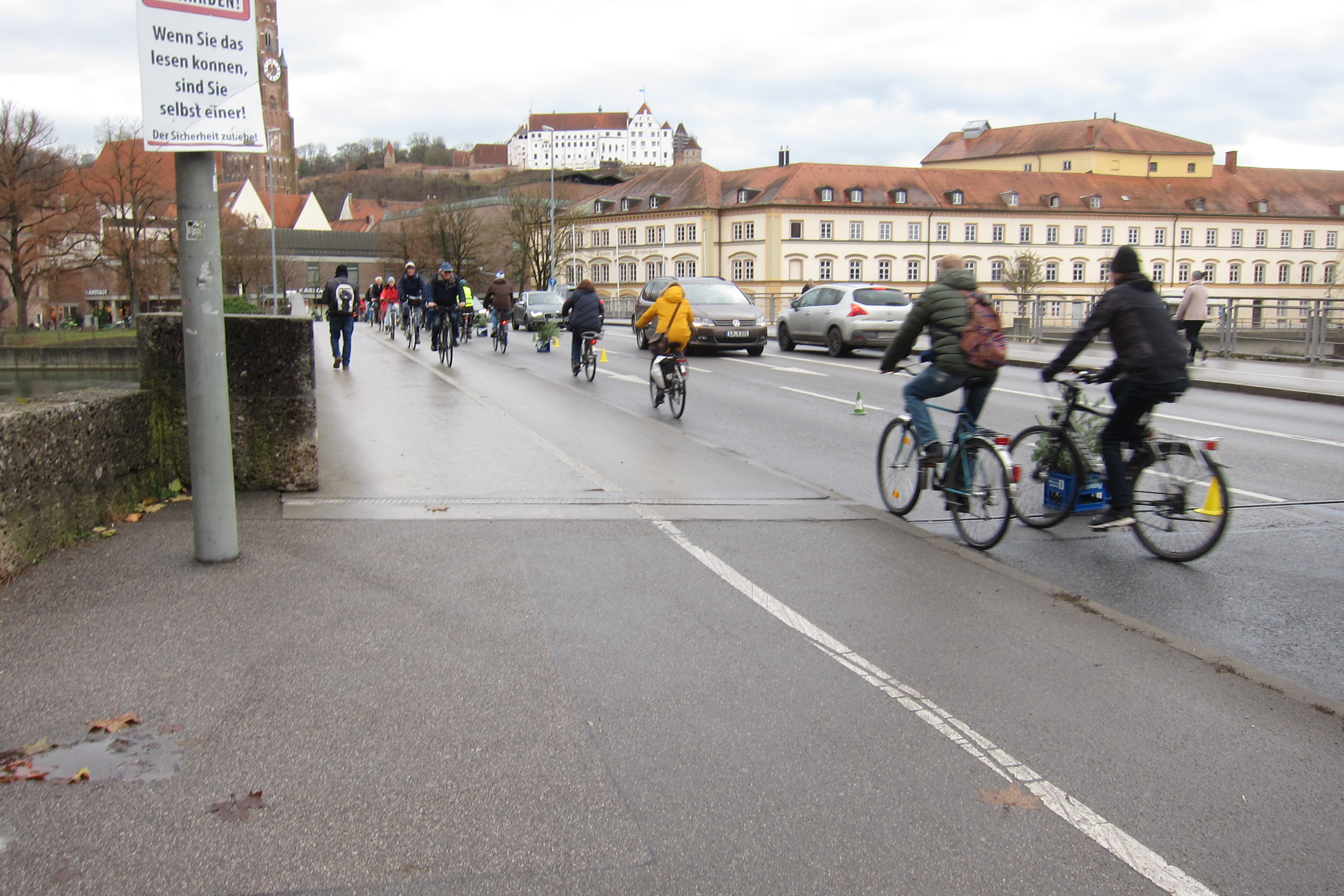 Am 7.Dezember gab es die zweite Demo auf der Luitpoldbrücke für eine zusätzliche Radspur auf der Fahrbahn. Damit soll eine bessere Verbindung direkt von der Papiererstraße in die Altstadt geschaffen werden.