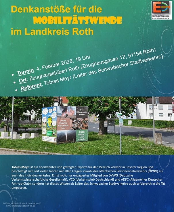 Tobias Mayr (Leiter des Schwabacher Stadtverkehrs und Mitglied des VCD Schwabach-Roth) spricht am 4. Februar 2026 um 19 Uhr über interessante Aspekte der Mobilitätswende - beispielsweise über den Zusammenhang zwischen Politikverdrossenheit und schlechtem öffentlichen Verkehr.