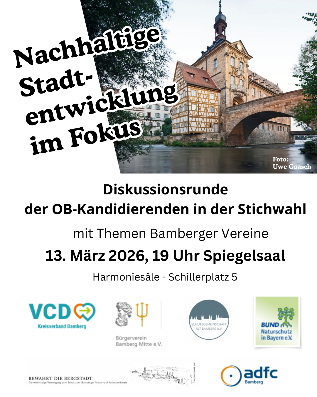 Nachhaltige Stadtentwicklung, moderne Mobilität, lebenswerte Viertel: Der Initiative des VCD haben sich weitere 5 Vereine angeschlossen, um den Kandidierenden der OB-Stichwahl in Bamberg die wichtigsten Fragen zu stellen: Bürgerverein Mitte, Schutzgemeinschaft Alt-Bamberg, Verein Bewahrt die Bergstadt, Bund Naturschutz und ADFC.