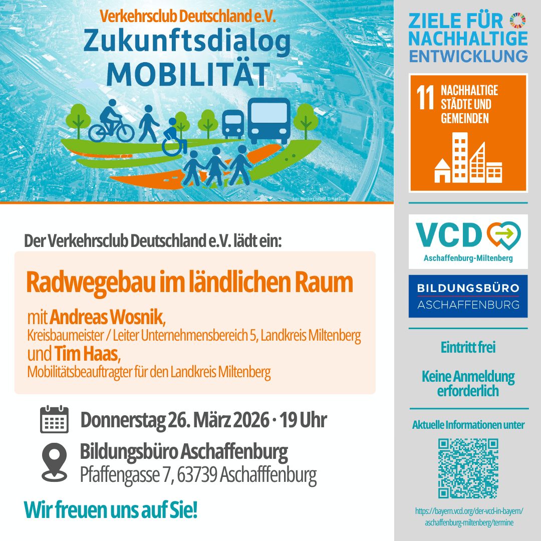 Umso mehr freuen wir uns, dass wir mit Andreas Wosnik, Kreisbaumeister im Landratsamt Miltenberg, und Tim Haas, Mobilitätsbeauftragter aus dem Landkreis Miltenberg, zwei ausgewiesene Fachleute gewinnen konnten. Sie werden zum Thema „Radwegebau im ländlichen Raum“ referieren und Einblicke in aktuelle Planungen, praktische Erfahrungen und zukünftige Perspektiven geben.