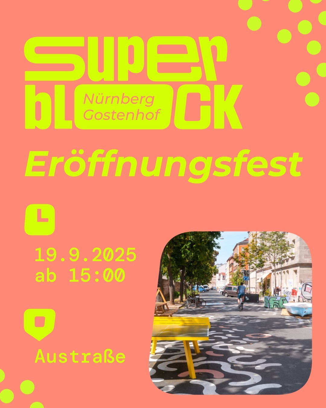 Wir haben an der Kreuzung Austr. /Kernstr. einen Infostand bei unserem Wanderbaum. Christian Vogel, 3. Bürgermeister, wird den Superblock eröffnen.