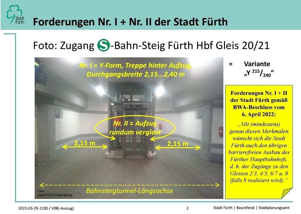 Diese will aus Kostengründen den Durchgang rechts und links neben den neuen Aufzügen nur sehr schmal ausführen. Dadurch würde Gedränge unter den Fahrgästen entstehen. Bei den von uns und der Stadt Fürth geforderten breiteren Gängen muss die Deckenkonstruktion verstärkt werden. Diese Mehrkosten will die Deutsche Bahn nun auf die Stadt Fürth abwälzen. Deshalb stockt zur Zeit der Bau der dringend benötigten 3 Aufzüge.